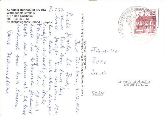 72419222 alte Postkarte Bad Duerrheim Kurklinik Huettenbuehl postalisch gelaufen Erhaltung siehe scans KatCode: 11110008326003