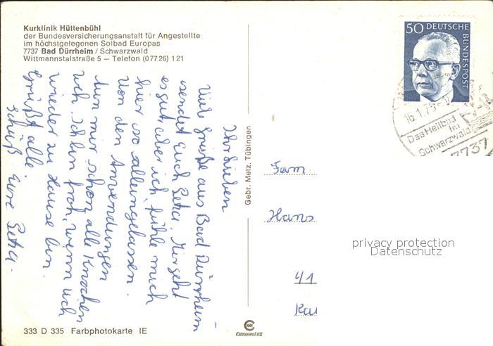 71901965 alte Postkarte Bad Duerrheim Kurklinik Huettenbuehl postalisch gelaufen Erhaltung siehe scans KatCode: 11110008326003