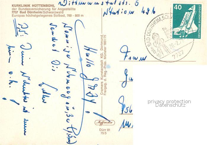 73655326 alte Postkarte Bad Duerrheim Kurklinik Huettenbuehl im Schwarzwald Fliegeraufnahme postalisch gelaufen Erhaltung siehe scans [FriedD77] KatCode: 11110008326003