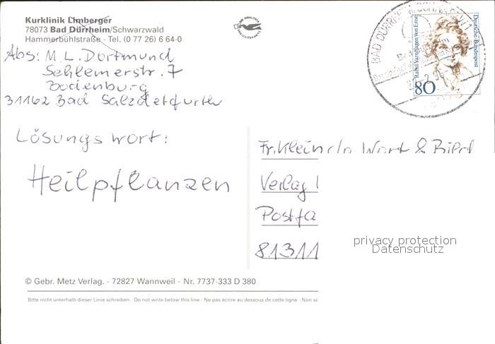 72064744 alte Postkarte Bad Duerrheim Kurklinik Limberger Hallenbad Speisesaal Garten postalisch gelaufen Erhaltung siehe scans KatCode: 11110008326003