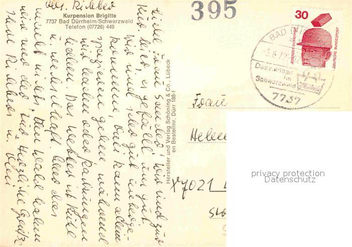72907098 alte Postkarte Bad Duerrheim Kurpension Brigitte Kurort im Schwarzwald postalisch gelaufen Erhaltung siehe scans [FriedD77] KatCode: 11110008326003