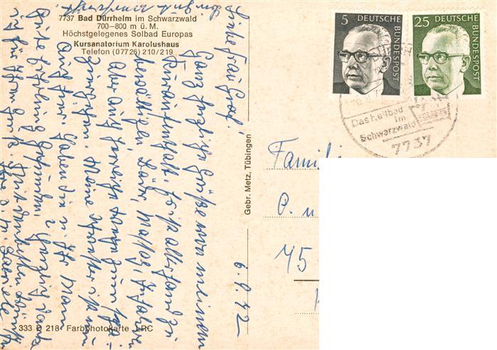73926858 alte Postkarte Bad Duerrheim Kursanatorium Karolushaus postalisch gelaufen Erhaltung siehe scans [FriedD77] KatCode: 11110008326003