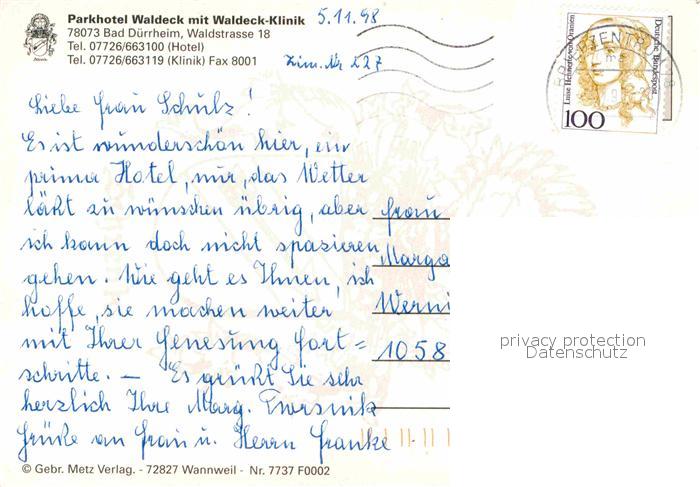 72896582 alte Postkarte Bad Duerrheim Parkhotel Waldeck mit Waldeck Klinik postalisch gelaufen Erhaltung siehe scans [FriedD77] KatCode: 11110008326003