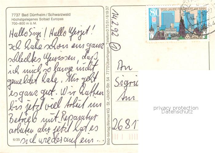 73685813 alte Postkarte Bad Duerrheim Solbad Fliegeraufnahme postalisch gelaufen Erhaltung siehe scans [WerneD78] KatCode: 11110008326003