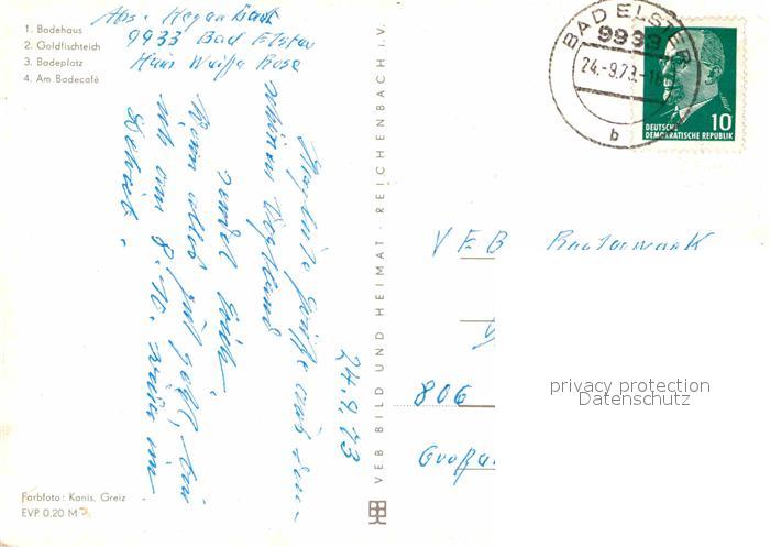 72919657 alte Postkarte Bad Elster Badehaus Goldfischteich Badeplatz Badecafe Park postalisch gelaufen Erhaltung siehe scans [FriedD77] KatCode: 11110014178050