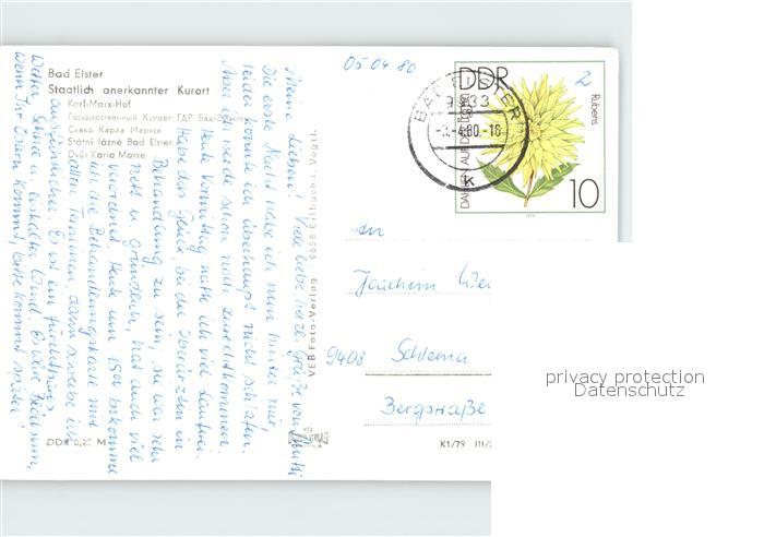 72384218 alte Postkarte Bad Elster Karl Marx Hof postalisch gelaufen Erhaltung siehe scans KatCode: 11110014178050