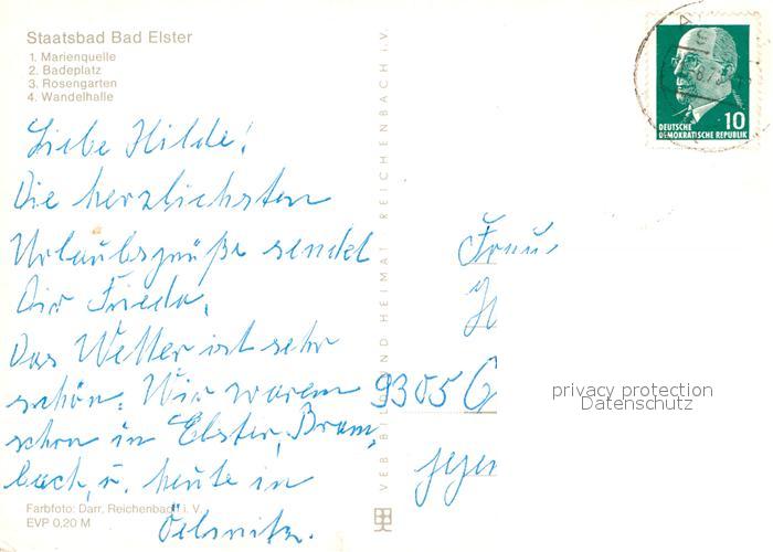 72971437 alte Postkarte Bad Elster Marienquelle Badeplatz Rosengarten Wandelhalle Springbrunnen postalisch gelaufen Erhaltung siehe scans [FriedD77] KatCode: 11110014178050