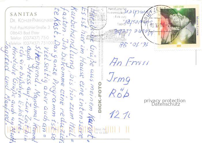 74044090 alte Postkarte BAD ELSTER Vogtland Sachsen Sanitas Dr Koehler Parkkliniken postalisch gelaufen Erhaltung siehe scans [WerneD78] KatCode: 11110014178050