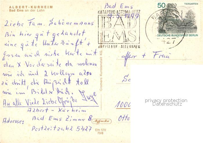 73128441 alte Postkarte Bad Ems Albert-Kurheim postalisch gelaufen Erhaltung siehe scans [NatalD47] KatCode: 11110007141006