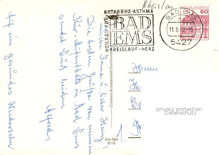 73228715 alte Postkarte Bad Ems Albert Kurheim Lahnpromenade Thermalbad Speisesaal Aufenthaltsraum postalisch gelaufen Erhaltung siehe scans [FriedD77] KatCode: 11110007141006