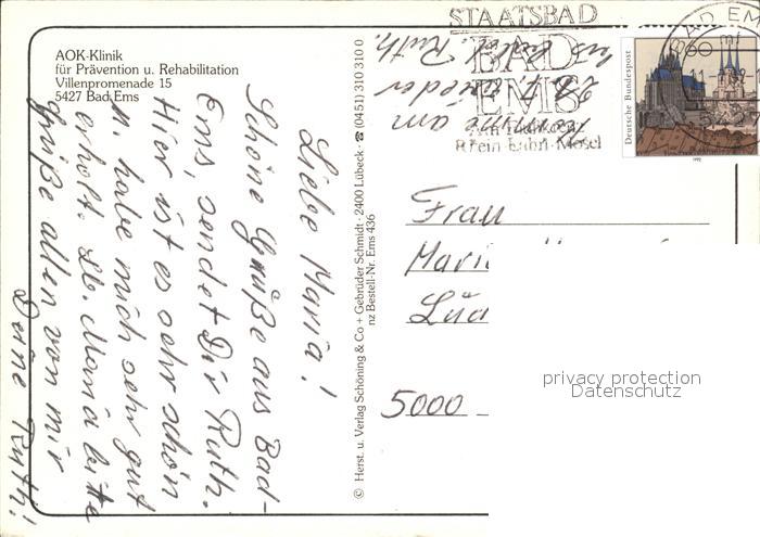 72511555 alte Postkarte Bad Ems AOK Klinik postalisch gelaufen Erhaltung siehe scans KatCode: 11110007141006