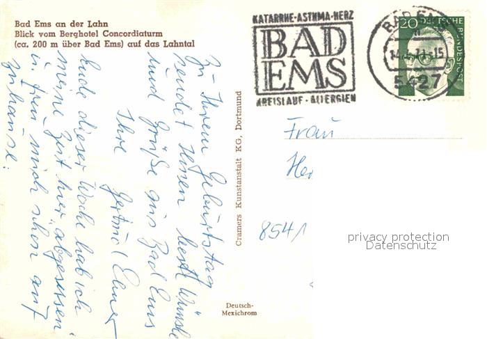 72750574 alte Postkarte Bad Ems Berghotel Concordiaturm mit Lahnpartie postalisch gelaufen Erhaltung siehe scans [LiesaD40] KatCode: 11110007141006