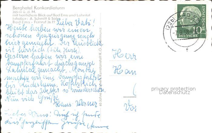 72006871 alte Postkarte Bad Ems Berghotel Konkordiaturm Lahntal postalisch gelaufen Erhaltung siehe scans KatCode: 11110007141006