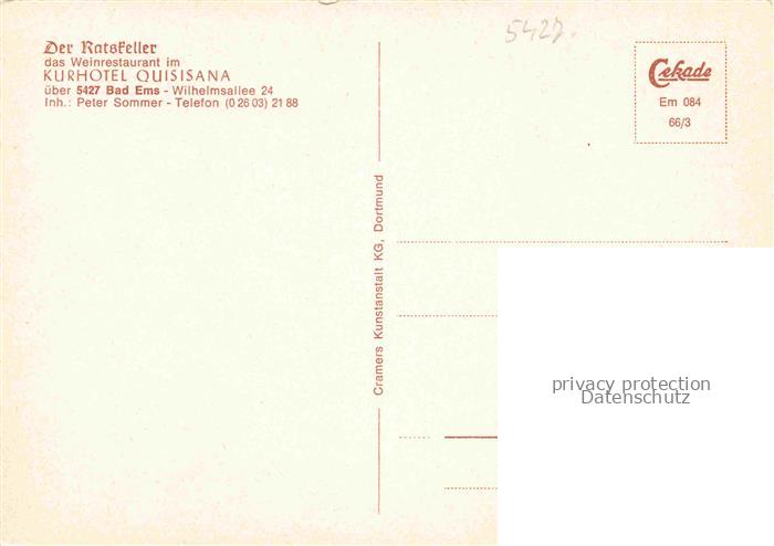 74050880 BAD EMS Der Ratskeller Weinrestaurant im Kurhotel Quisisana postalisch nicht gelaufen Erhaltung siehe scans [WerneD78] KatCode: 11110007141006