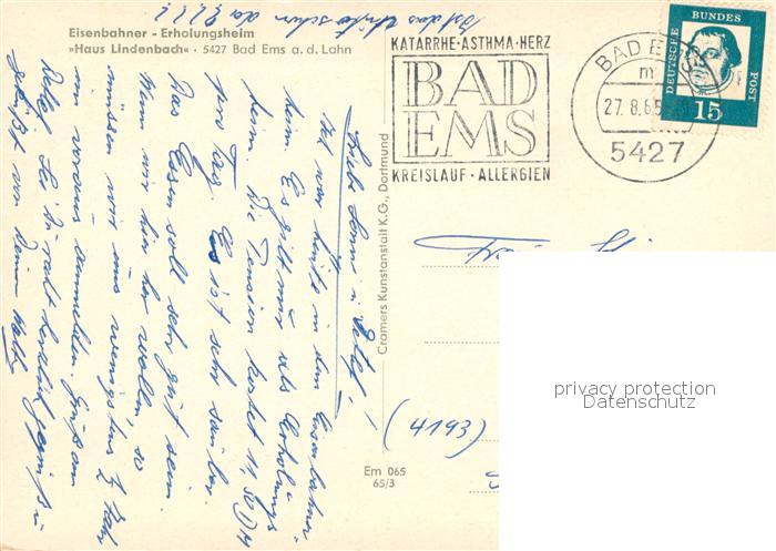 73648150 alte Postkarte Bad Ems Eisenbahner Erholungsheim Haus Lindenbach postalisch gelaufen Erhaltung siehe scans [FriedD77] KatCode: 11110007141006
