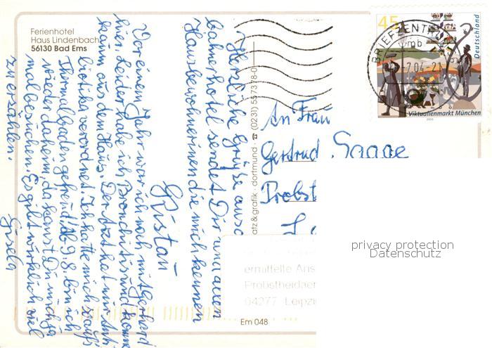 73834586 alte Postkarte Bad Ems Ferienhotel Haus Lindenbach Restaurant Terrasse Brunnen postalisch gelaufen Erhaltung siehe scans [FriedD77] KatCode: 11110007141006