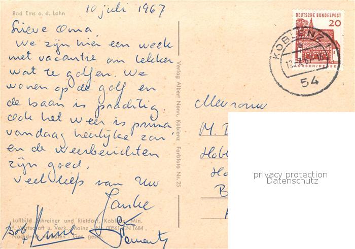 72936518 alte Postkarte Bad Ems Fliegeraufnahme postalisch gelaufen Erhaltung siehe scans [FriedD77] KatCode: 11110007141006