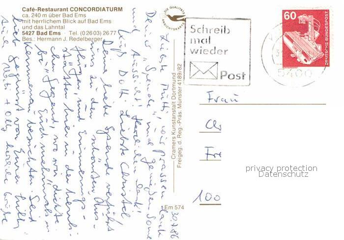 72895614 alte Postkarte Bad Ems Fliegeraufnahme Concordiaturm postalisch gelaufen Erhaltung siehe scans [WerneD78] KatCode: 11110007141006
