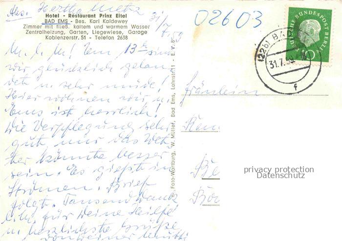74092143 alte Postkarte BAD EMS Hotel Restaurant Prinz Eitel Gastraeume Panorama postalisch gelaufen Erhaltung siehe scans [WerneD78] KatCode: 11110007141006