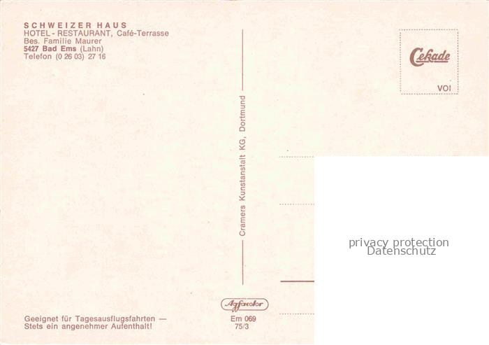 74040925 BAD EMS Hotel Restaurant Schweizerhaus Gastraeume Terrasse postalisch nicht gelaufen Erhaltung siehe scans [WerneD78] KatCode: 11110007141006