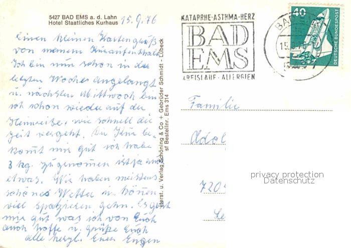 72905725 alte Postkarte Bad Ems Hotel Staatliches Kurhaus an der Lahn postalisch gelaufen Erhaltung siehe scans [FriedD77] KatCode: 11110007141006