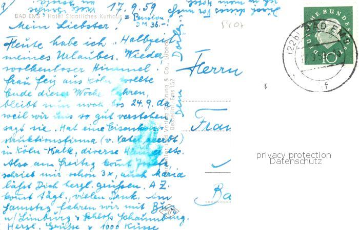 73834852 alte Postkarte Bad Ems Hotel Staatliches Kurhaus postalisch gelaufen Erhaltung siehe scans [WerneD78] KatCode: 11110007141006