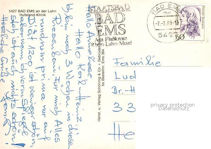 73005133 alte Postkarte Bad Ems Hufeland Klinik postalisch gelaufen Erhaltung siehe scans [WerneD78] KatCode: 11110007141006