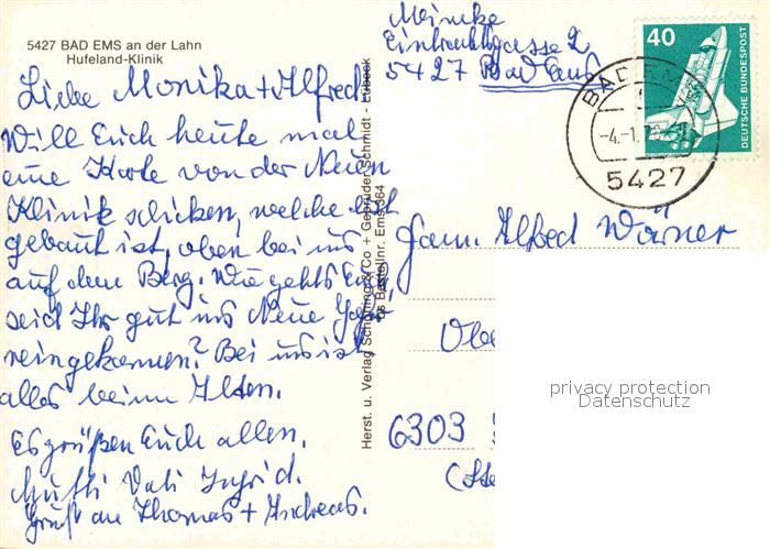 72779703 alte Postkarte Bad Ems Hufeland Klinik postalisch gelaufen Erhaltung siehe scans [FriedD77] KatCode: 11110007141006