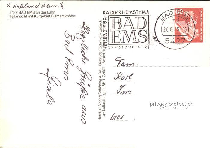 72374713 alte Postkarte Bad Ems Kurgebiet Bismarckhoehe postalisch gelaufen Erhaltung siehe scans KatCode: 11110007141006