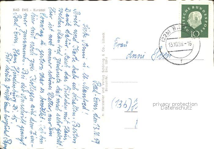 72537633 alte Postkarte Bad Ems Kursaal postalisch gelaufen Erhaltung siehe scans [AndreD76 kt119box] KatCode: 11110007141006