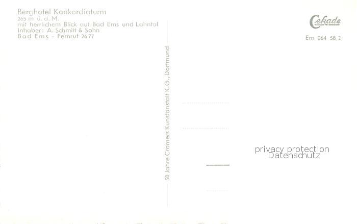 73810828 Bad Ems Lahn Berghotel Konkordiaturm Terrasse Panorama postalisch nicht gelaufen Erhaltung siehe scans [WerneD78] KatCode: 11110007141006