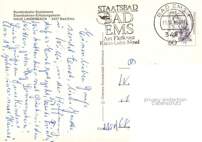 73785185 alte Postkarte Bad Ems Lahn Bundesbahn Sozialwerk Haus Lindenbach Freiterrasse Speisesaal postalisch gelaufen Erhaltung siehe scans [WerneD78] KatCode: 11110007141006