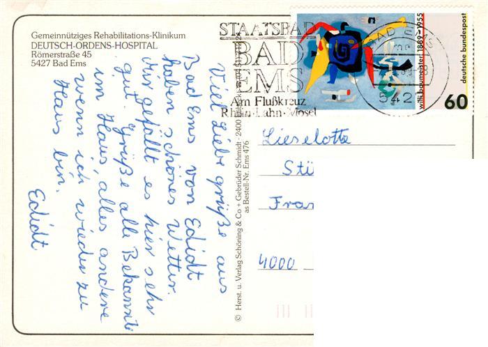 73905631 alte Postkarte Bad Ems Lahn Deutsch Ordens Hospital Rezeption Gastraeume postalisch gelaufen Erhaltung siehe scans [FriedD77] KatCode: 11110007141006