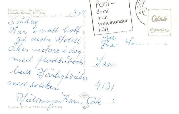 73938044 alte Postkarte Bad Ems Lahn Kurhotel Balzer postalisch gelaufen Erhaltung siehe scans [FriedD77] KatCode: 11110007141006