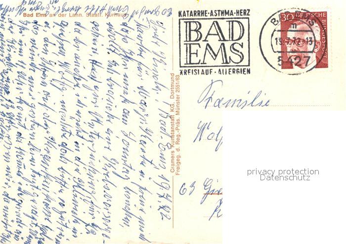 73022689 alte Postkarte Bad Ems Staatl Kurhaus postalisch gelaufen Erhaltung siehe scans [WerneD78] KatCode: 11110007141006
