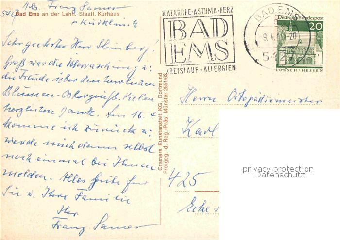 72724312 alte Postkarte Bad Ems Staatliches Kurhaus Blumenbeet postalisch gelaufen Erhaltung siehe scans [FriedD77] KatCode: 11110007141006