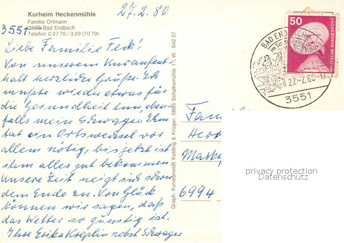 73106441 alte Postkarte Bad Endbach Kurheim Heckenmuehle postalisch gelaufen Erhaltung siehe scans [KathaD81] KatCode: 11110006534003