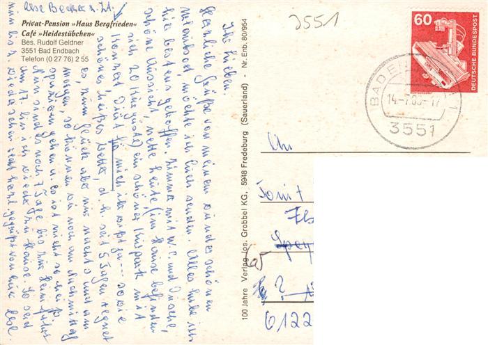 73935047 alte Postkarte Bad Endbach Pension Haus Berfrieden Cafe Heidestuebchen postalisch gelaufen Erhaltung siehe scans [FriedD77] KatCode: 11110006534003