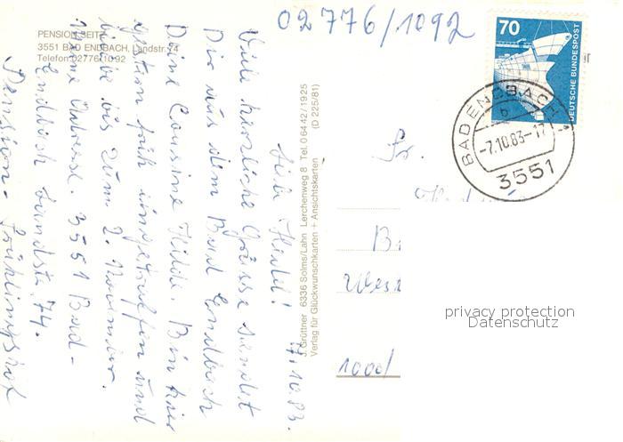 73641091 alte Postkarte Bad Endbach Pension Seitz postalisch gelaufen Erhaltung siehe scans [WerneD78] KatCode: 11110006534003