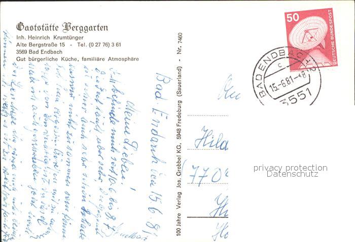 71952466 alte Postkarte Bad Endbach Restaurant Berggarten postalisch gelaufen Erhaltung siehe scans KatCode: 11110006534003