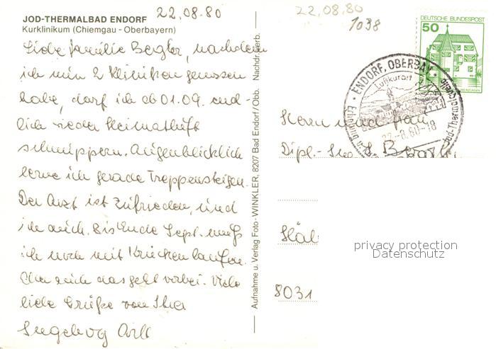 73149070 alte Postkarte Bad Endorf Jod Thermalbad Kurklinikum Fliegeraufnahme postalisch gelaufen Erhaltung siehe scans [FriedD77] KatCode: 11110009187128