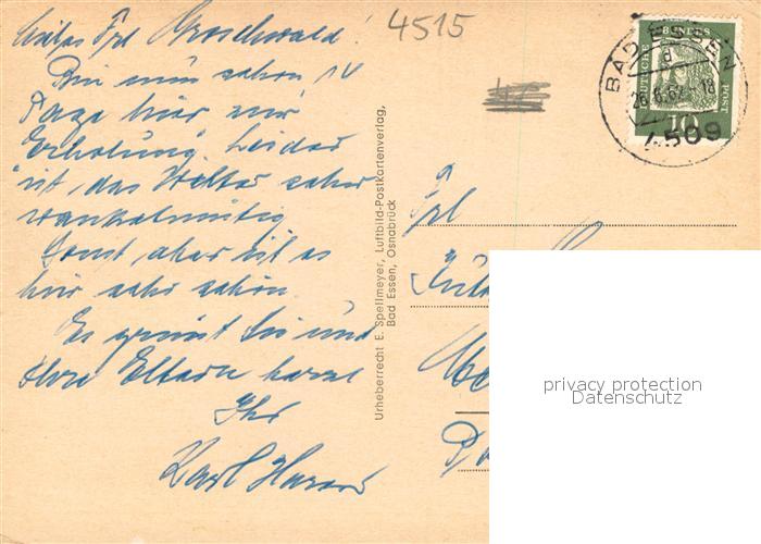 73701514 alte Postkarte Bad Essen Alte Muehle Trinkbrunnen Gesamtansicht Kirchplatz Solbad Karlsplatz Rossstrasse Schwanenteich Bluehende Bergstrasse postalisch gelaufen Erhaltung siehe scans [LiesaD40] KatCode: 11110003459003
