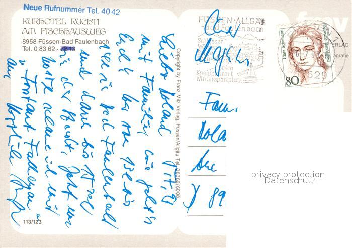 73124164 alte Postkarte Bad Faulenbach Kurhotel Ruchti am Fischhausweg postalisch gelaufen Erhaltung siehe scans [LiesaD40] KatCode: 11110009777129