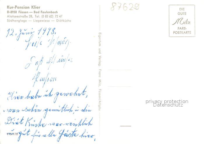73167306 Bad Faulenbach Kurpension Klier postalisch nicht gelaufen Erhaltung siehe scans [FriedD77] KatCode: 11110009777129
