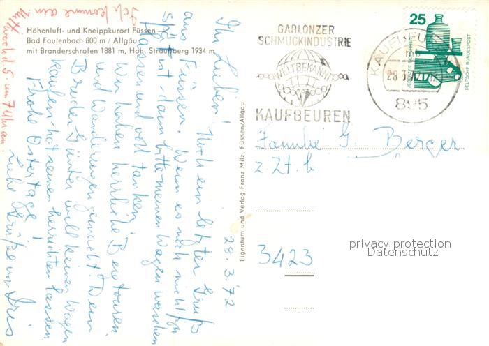73252445 alte Postkarte Bad Faulenbach mit Branderschrofen und Hohem Straussberg postalisch gelaufen Erhaltung siehe scans [WerneD78] KatCode: 11110009777129