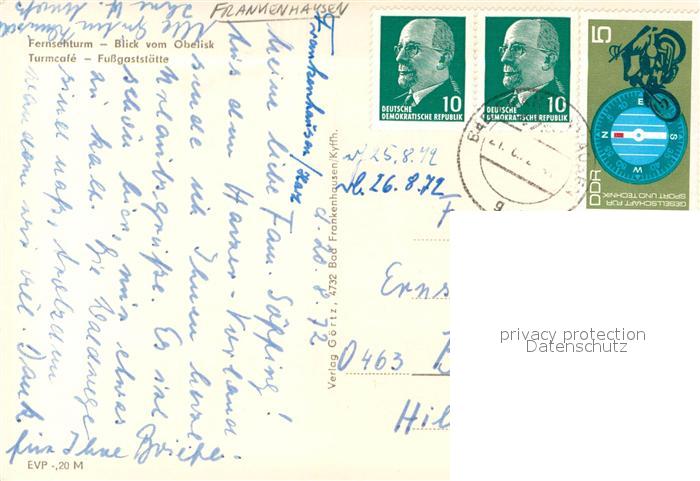 73669600 alte Postkarte Bad Frankenhausen Fernsehturm Blick vom Obelisk TurmCafe Gaststaette postalisch gelaufen Erhaltung siehe scans [FriedD77] KatCode: 11110016065003