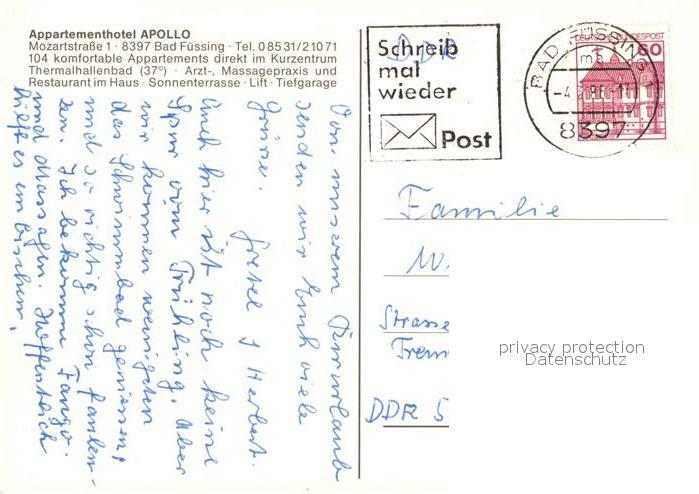 73066457 alte Postkarte Bad Fuessing Appartementhotel Apollo postalisch gelaufen Erhaltung siehe scans [FriedD77] KatCode: 11110009275116