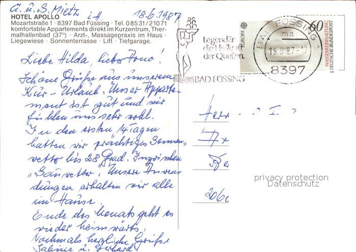 72539314 alte Postkarte Bad Fuessing Hotel Apollo postalisch gelaufen Erhaltung siehe scans [AndreD76 kt119box] KatCode: 11110009275116