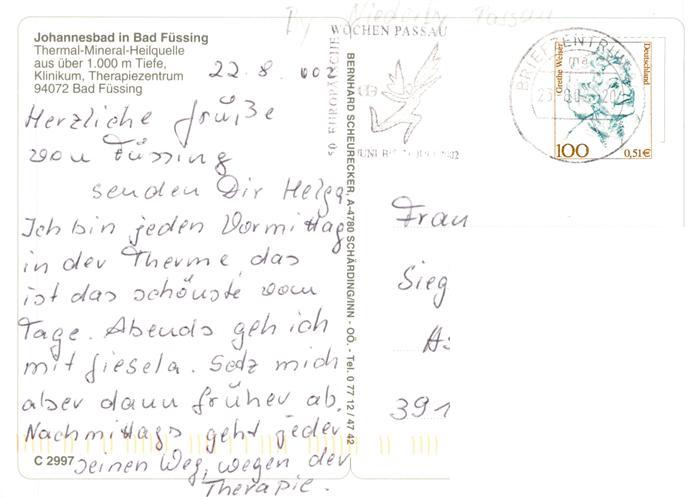 73945917 alte Postkarte Bad Fuessing Johannesbad Thermal-Mineral-Heilquelle Klinikum Therapiezentrum postalisch gelaufen Fliegeraufnahme Erhaltung siehe scans [FriedD77] KatCode: 11110009275116