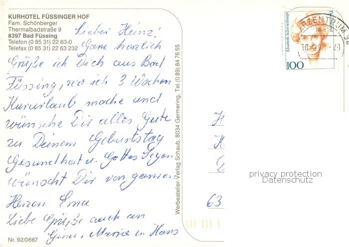 73758099 alte Postkarte Bad Fuessing Kurhotel Fuessinger Hof Thermalbad postalisch gelaufen Erhaltung siehe scans [LiesaD40] KatCode: 11110009275116